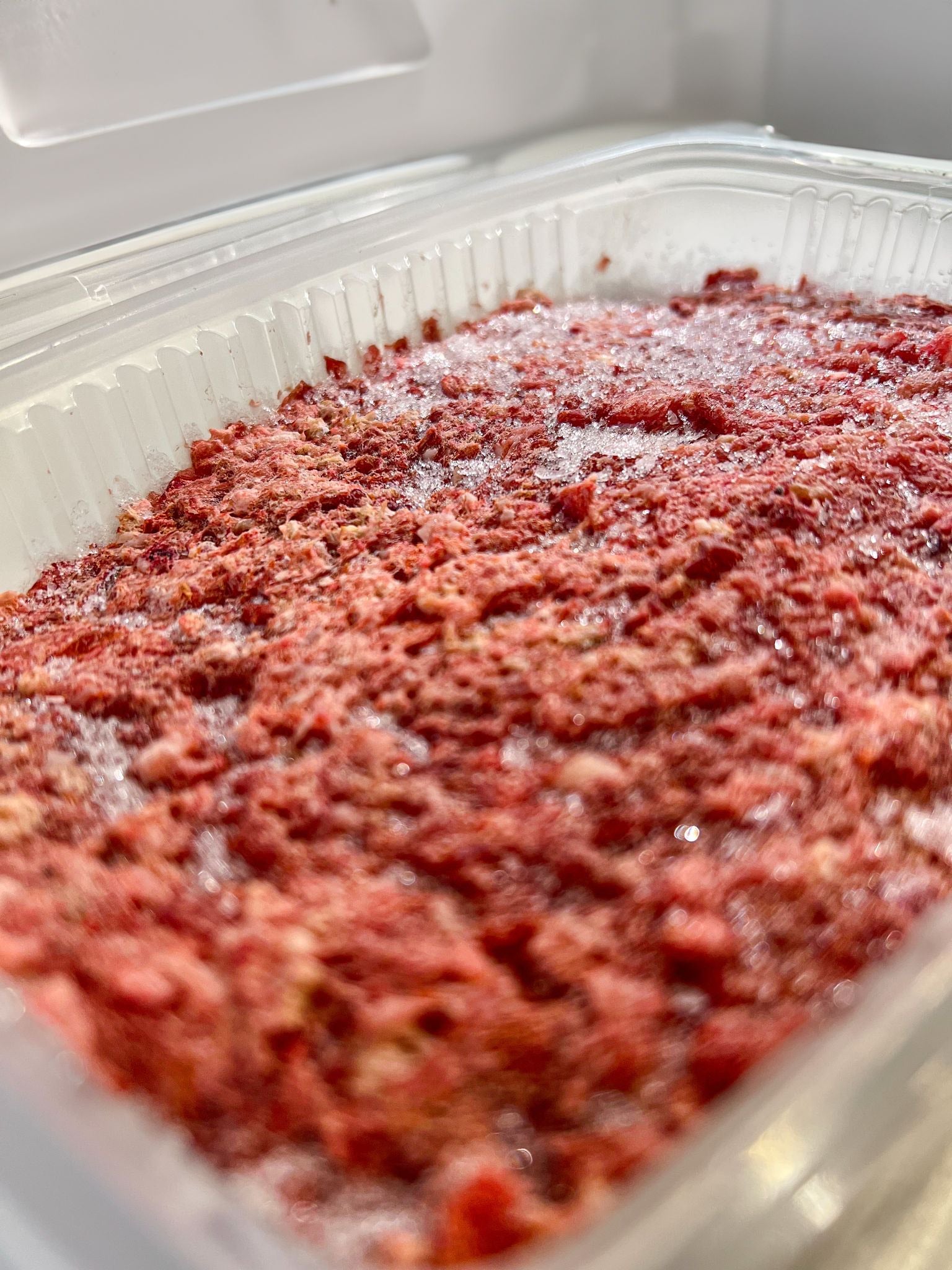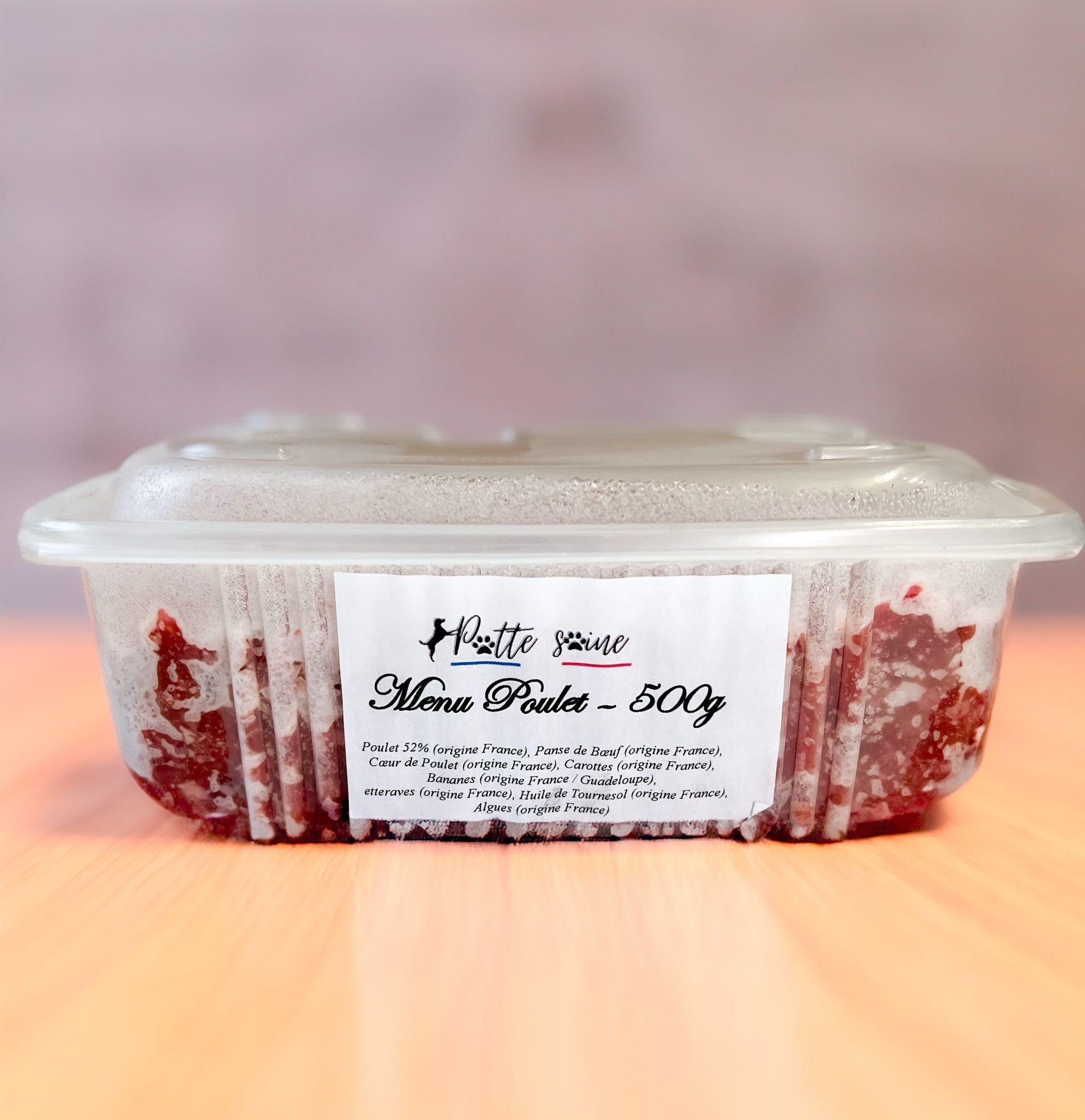 Découvrez notre Barf au Poulet 100% origine France. Une alimentation crue et équilibrée pour chiens et chats, composé d'ingrédients naturels et frais. Composé de Poulet 52%, dont 10% d'Os, de Panse de Bœuf, Cœur de Poulet, Carottes, Bananes, Betteraves, Huile de Tournesol et Algues Marines.